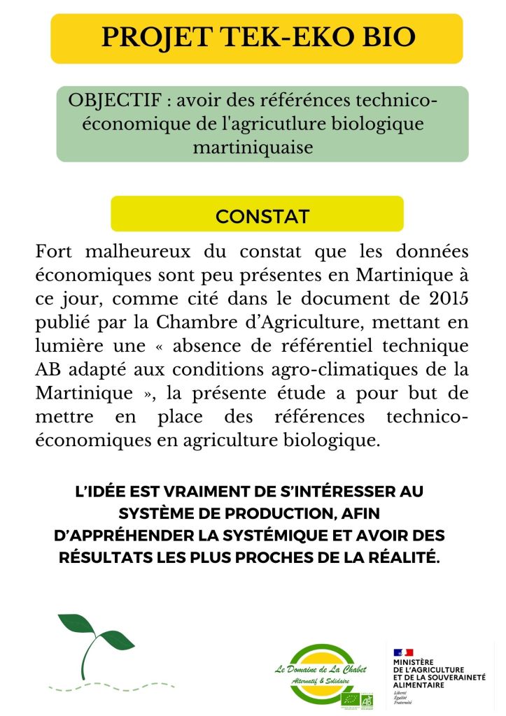 Fort malheureux de constater que les données technico-économiques soient peu présentes en Martinique à ce jour, comme cité dans le document de 2015 publié par la Chambre d’Agriculture, mettant en lumière une « absence de référentiel technique AB adapté aux conditions agro-climatiques de la Martinique », ce qui amenait donc à réaliser des « préconisations qui s’inspirent des bases de l’agrobiologie », la présente étude, menée par Le Domaine de la Chabet, a pour but de mettre en place des références technico-économiques en agriculture biologique.